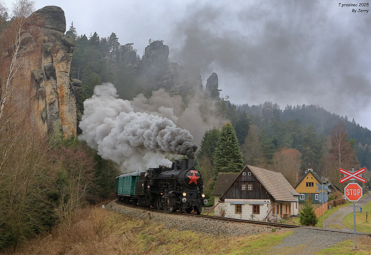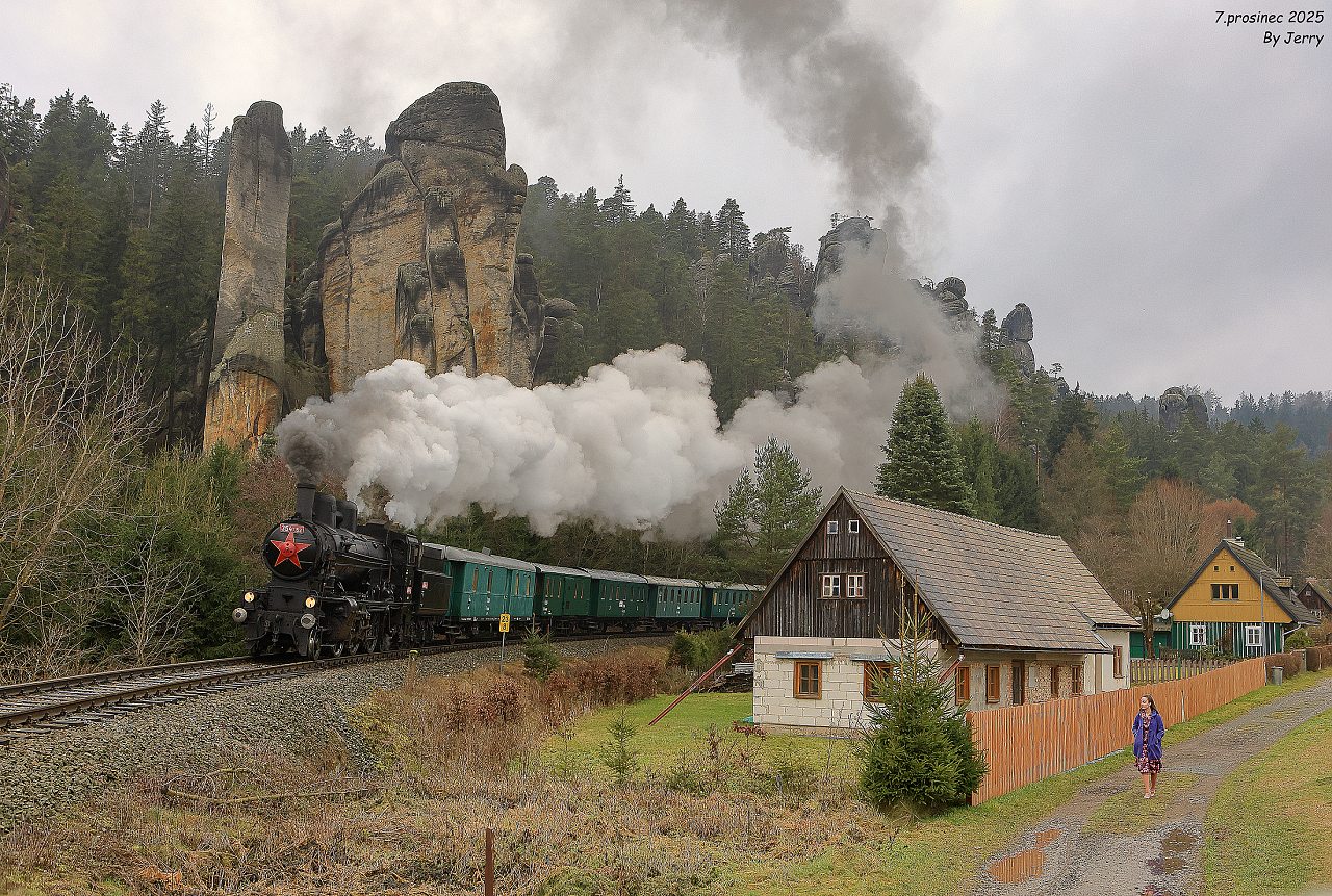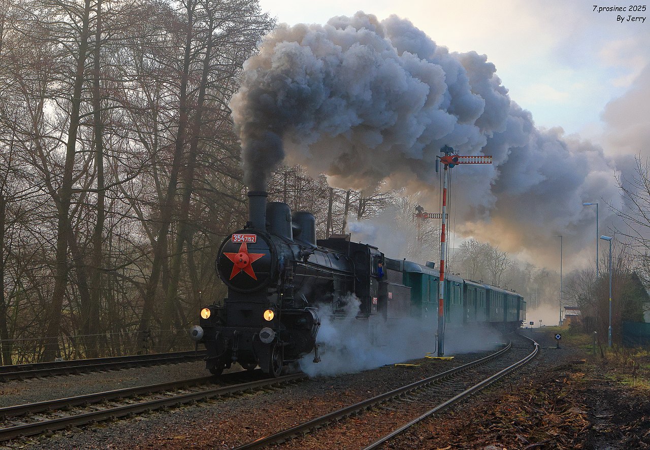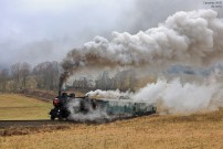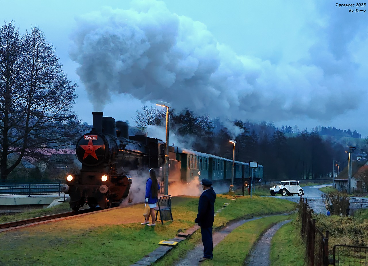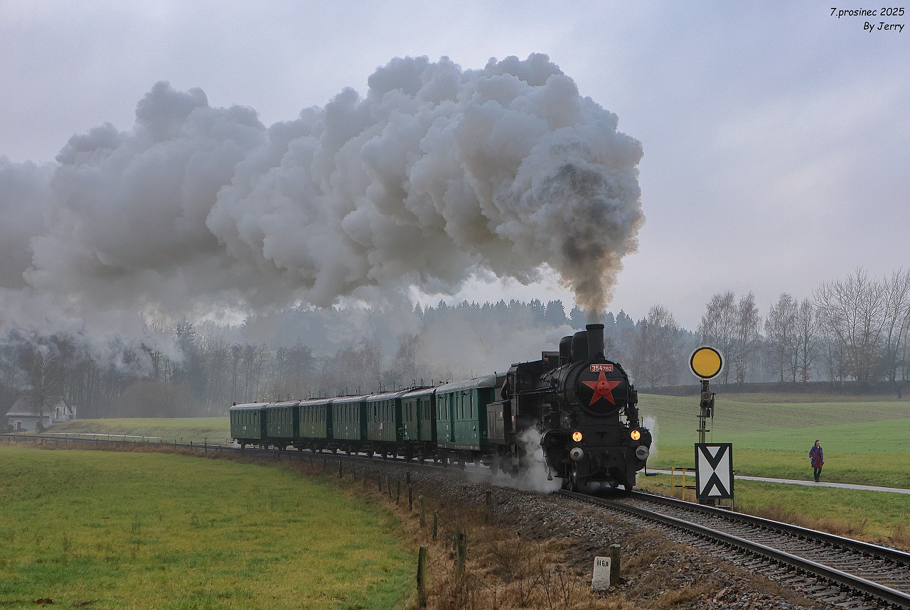 Závěrečný snímek z jedné povedené akce, na které bylo jedinou kaňkou ne zrovna ideální zimní počasí, zachycuje průjezd mezistaničním úsekem Jindřichov na Moravě -Potůčník. Cílem akce bylo zavzpomínat na pravidelné nasazení této lokomotivy právě na tratích přes Ramzovské sedlo,což se i díky dobové soupravě povedlo na výbornou. Jelikož v roce 2026 končí lokomotivě technická způsobilost kotle, jednalo se patrně o jednu z posledních možností v těchto končinách dříve domácí lokomotivu zachytit